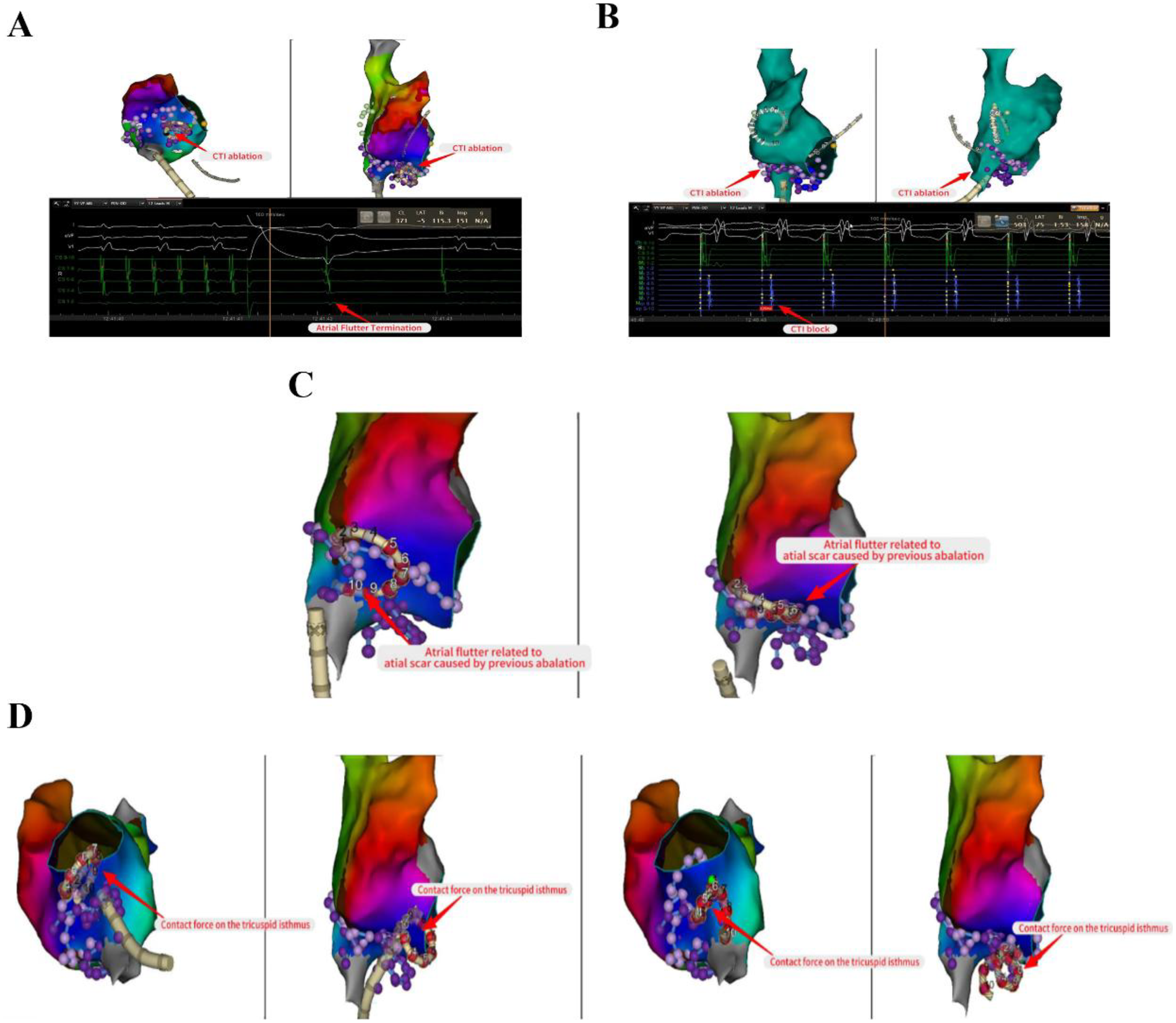 The propagation pattern in the left atrial revealed that the atrial septum was excited earlier (Figure 3A). Based on the early onset features of atrial flutter in Cs9-10, we decided to persist with mapping the propagation in the right atrial. The right atrial substrate mapping clearly showed a low-voltage area in the right atrial (Figure 3B). The activation mapping revealed the presence of two reentrant loops in the right atrial, one of which traveled around the tricuspid annulus, and the other around the surgical incision (Figures 3C,D). We ultimately ablated the tricuspid isthmus to halt atrial flutter and validated the tricuspid isthmus line block after the surgical procedure (Figures 4A,B). Complete block was achieved through segment-by-segment ablation using a steerable sheath to ensure electrode contact. Due to the history of atrial septal defect repair, mapping of right atrial excitation revealed atrial flutter excitation around the incision fold, leading to continued linear ablation along the incision towards the inferior vena cava (Figure 4C). Following the completion of ablation, atrial burst pacing and pharmacological provocation with isoproterenol injection were performed, and the patient had no recurrence of arrhythmia. All ablations above were performed with a uniform energy setting of 1800 V. The series of images comprehensively illustrates the technique of the VARIPULSE™ catheter adhesion to the isthmus of the tricuspid valve (Figure 4D).