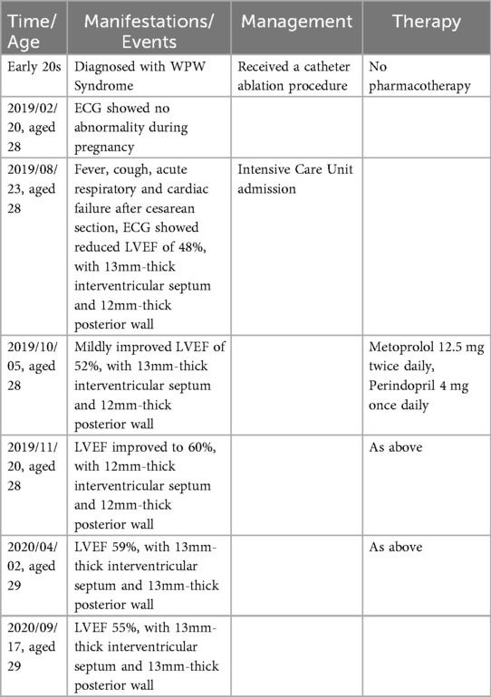 In her early twenties, she was diagnosed with Wolff-Parkinson-White (WPW) Syndrome and underwent catheter ablation procedure at a local hospital. Despite persistent intermittent palpitations, she received no pharmacotherapy. In 2019, at 39 weeks' gestation, she developed a fever requiring intensive care unit admission for acute respiratory and cardiac failure following emergency cesarean section. Echocardiography (ECG) showed mild left ventricular hypertrophy with thickness of 13 mm in interventricular septum and 12 mm in posterior wall, and impaired systolic function with left ventricular ejection fraction (LVEF) of 48%. Diagnosed with peripartum cardiomyopathy, she was initiated on Metoprolol 12.5 mg twice daily and Perindopril 4 mg once daily. Follow-up echocardiography revealed improved left ventricular systolic function (LVEF 60%), although left ventricular wall thickness remained unchanged.
