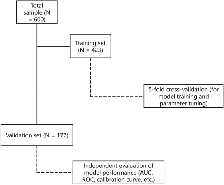 Total sample size: 600 non-diabetic patients undergoing cardiac surgery. Data partitioning: The dataset was randomly divided into a training (modeling) set (n = 423, 70%) and an independent validation set (n = 177, 30%).