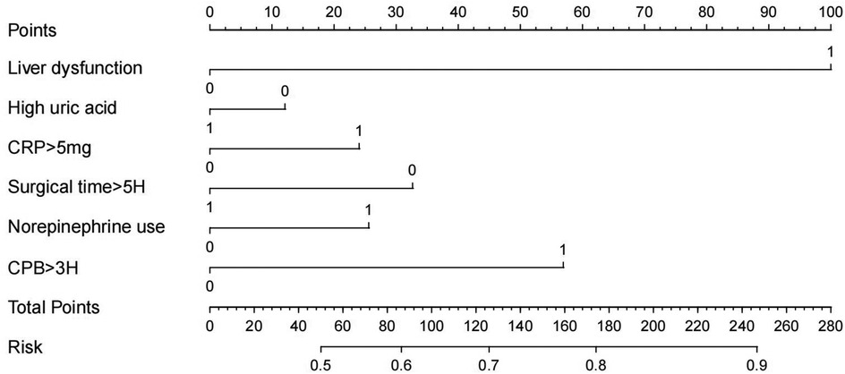 Based on the logistic regression analysis results, a risk prediction model for the occurrence of SHG in patients without diabetes undergoing cardiac surgery was constructed by incorporating significant factors. The logistic regression equation is as follows: −4.504 + (1.35 × Liver dysfunction) + (2.842 × High uric acid) + (2.016 × CRP > 5 mg) + (−1.682 × Surgical time >5H) + (2.486 × Norepinephrine use) + (2.506 × CPB >3H). A visual nomogram was developed, with each factor assigned a specific score. The total score—the sum of all individual scores—corresponds to the probability of SHG occurrence in non-diabetic cardiac surgery patients (Figure 1).