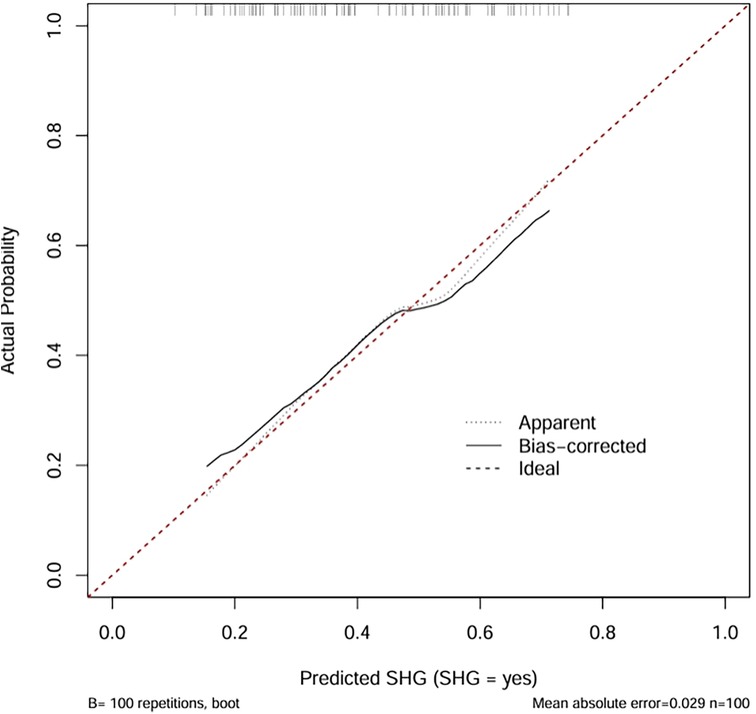 The calibration plot assessed the accuracy of predicted probabilities from the logistic regression model (Figure 4). The “Apparent” curve represents the model's performance on the training data, while the “Bias-corrected” curve, derived via bootstrap resampling (B = 100 repetitions), adjusts for overfitting. Both curves closely align with the ideal diagonal, indicating excellent agreement between predicted probabilities and observed outcomes. The minimal mean absolute error of 0.029 further confirms high calibration accuracy, suggesting that the model provides reliable probability estimates for clinical application.