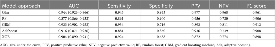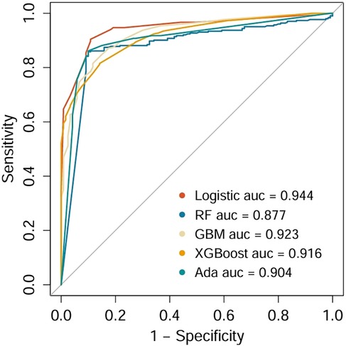 In this study, five models—logistic regression (GLM), random forest (RF), gradient boosting machine (GBM), XGBoost, and AdaBoost—were constructed for comparison. To ensure fair comparison across models, all algorithms were trained using default parameter configurations without systematic hyperparameter tuning, except for the GBM model, in which the optimal number of trees was selected via fivefold cross-validation. This strategy minimized human-induced optimization bias, ensured consistent evaluation conditions, and maintained the stability and reproducibility of the results.