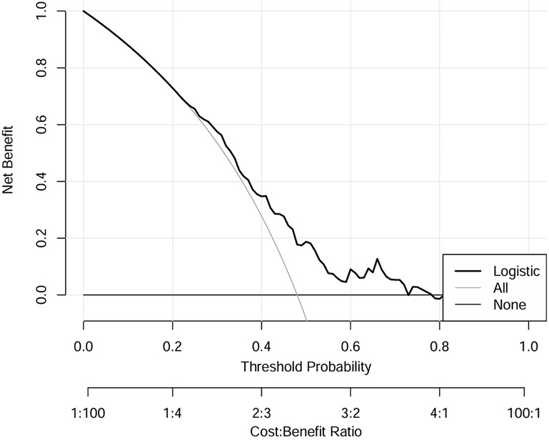 Figure 5 presents the decision curve analysis (DCA), which evaluated the clinical utility of the nomogram for predicting SIH in non-diabetic cardiac surgery patients. The analysis framework incorporates: (1) threshold probability (x-axis) representing the minimum predicted risk at which clinical intervention would be considered, and (2) net benefit (y-axis) quantifying the trade-off between true-positive identifications and false-positive interventions across the probability spectrum. The logistic regression model demonstrated superior clinical utility, as evidenced by its consistently high net benefit across the clinically relevant threshold probability range of 20%–80%. This robust performance indicates that the model provides meaningful decision support for perioperative glycemic management in the specified risk range.
