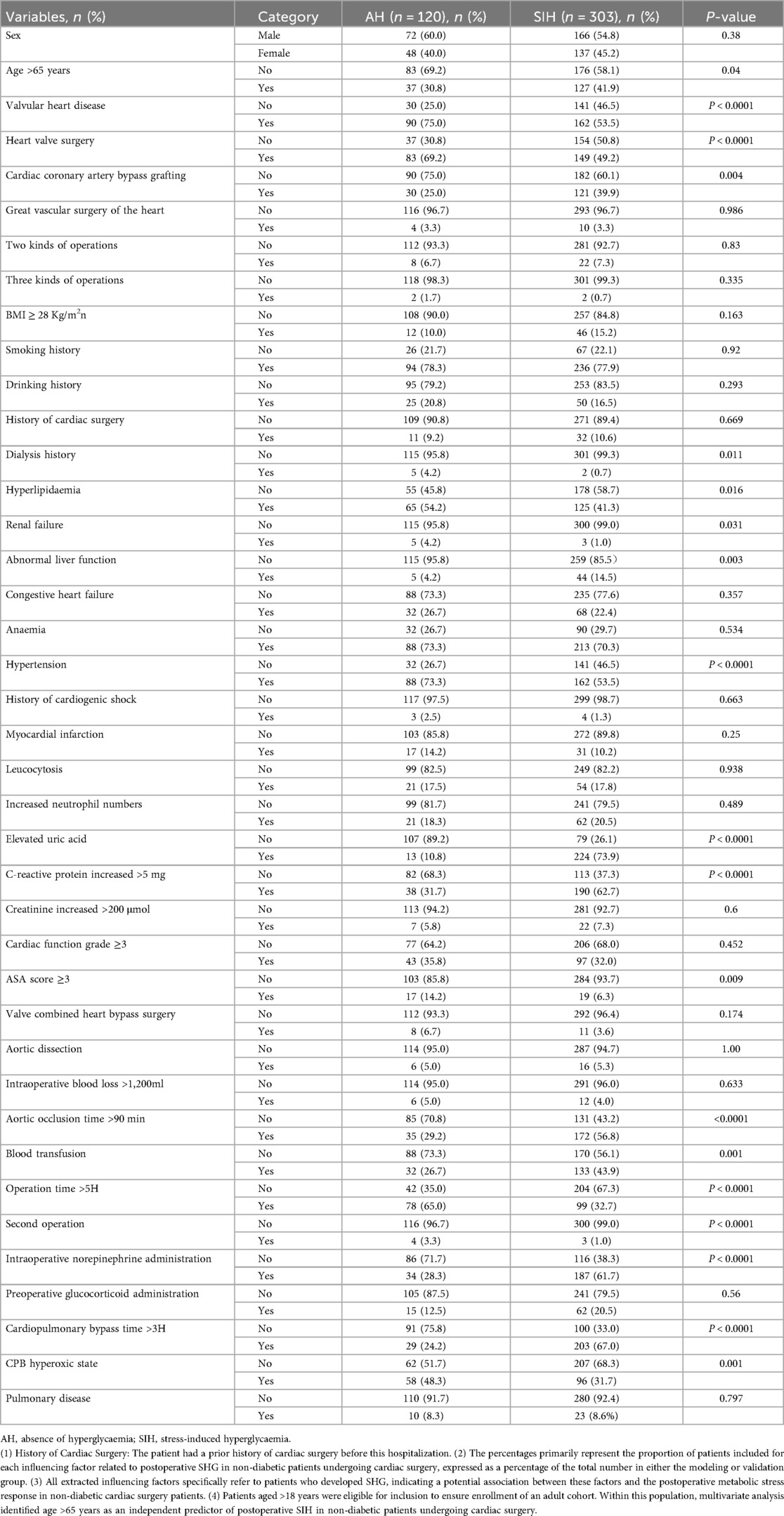 This retrospective cohort study evaluated 600 consecutive adult patients (>18 years) undergoing cardiac surgery at the First Affiliated Hospital of Bengbu Medical University between January 2021 and May 2025. Following rigorous application of inclusion/exclusion criteria with complete case analysis (no exclusions for missing data), the cohort was stratified into model development (n = 423) and validation (n = 177) groups. Postoperative stress-induced hyperglycemia (P-SIH) within 48–72 h occurred in 423 patients (70.5%), consistent with established metabolic stress responses following cardiac procedures. Analysis of P-SIH cases (n = 303) revealed male predominance (54.8% vs. 45.2% female) with primary surgical indications being valve procedures (49.2%) and coronary artery bypass grafting (39.9%). Key risk factors included advanced age (>65 years, 41.9%), obesity (BMI ≥28 kg/m2, 15.2%), and prevalent comorbidities, such as hypertension (53.5%), hyperlipidemia (41.3%), and congestive heart failure (22.4%). Notable metabolic markers included elevated uric acid (73.9%) and anemia (70.3%). Significant surgical factors comprised prolonged cardiopulmonary bypass (>3 h, 67%), extended aortic cross-clamp time (>90 min, 56.8%), and lengthy procedures (>5 h, 32.7%). Pharmacological contributors included norepinephrine administration (61.7%) and preoperative glucocorticoid use (79.5%), with high-risk patients (ASA ≥3: 6.3%; NYHA class ≥3: 32%) demonstrating particular susceptibility. The complete perioperative characteristics are detailed in Table 1.