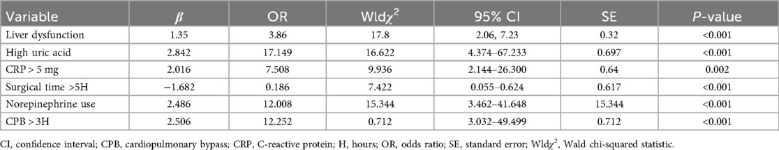 A training dataset comprising 423 patients was used to develop the predictive model (Figure 2). The results of the univariate logistic regression analysis are presented in Table 2. Variables that were statistically significant in the univariate analysis were included in the multivariate logistic regression model. The independent risk factors for SIH identified in this analysis included liver dysfunction, high uric acid, CRP > 5 mg, surgical time >5 h, norepinephrine use, and CPB > 3H.