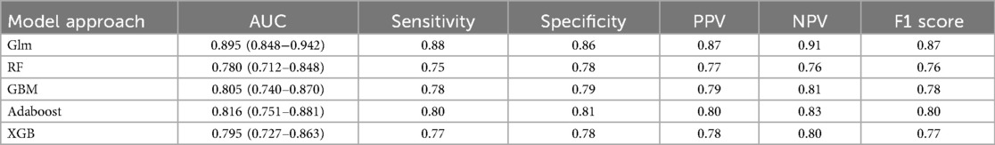 In the validation cohort (Table 4), GLM model maintained the best overall performance among all tested algorithms, with an AUC of 0.895 (95% CI: 0.848–0.942), sensitivity of 0.88, specificity of 0.86, PPV of 0.87, NPV of 0.91, and F1 score of 0.87. Ensemble models, including Random Forest (AUC = 0.780), GBM (AUC = 0.805), AdaBoost (AUC = 0.816), and XGBoost (AUC = 0.795), showed moderate predictive ability. These results further confirmed the strong discriminative capacity and external generalizability of the logistic regression model, justifying its selection for the final nomogram construction.