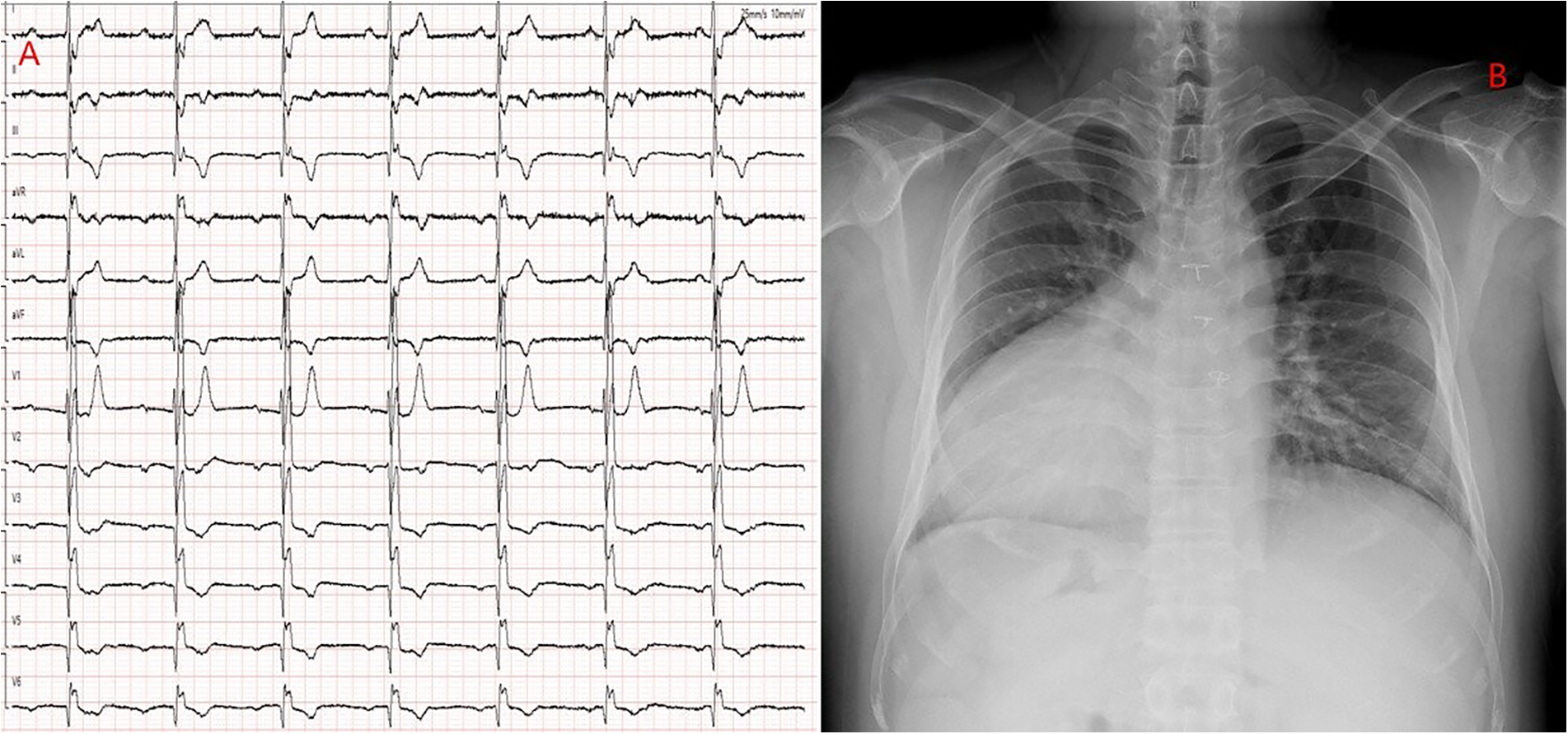 (A) ECG with reversed limb leads: Shows third-degree atrioventricular block and complete right bundle branch block. (B) Chest x-ray: Demonstrates a mirrored right-sided heart.