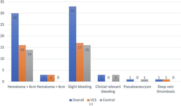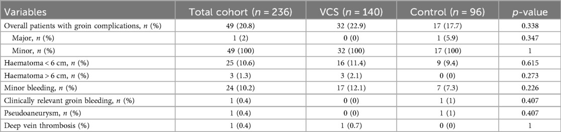 Overall, vascular access site complications occurred in 22.5% of all patients. No major complications were reported in the VCS group, whereas one major complication (pseudoaneurysm) occurred in the control group (p = 1). Clinically relevant bleeding events not requiring transfusion were observed in 2.1% of control group patients and none in the VCS group. The most frequent complication in both groups was groin haematoma <6 cm (11.4% vs. 10.0%, p = 0.699). One patient in the control group experienced a femoral pseudoaneurysm that required surgery. The postoperative course was complicated by sepsis and multiorgan failure, resulting in death. Same-day discharge was performed exclusively in the VCS group (7.9% vs. 0%, p < 0.001). Detailed results are presented in Tables 2, 3 and Figure 3.