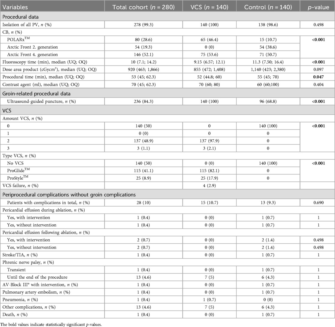 In the context of same-day discharge, effective vascular access management—aimed at minimising bleeding and enabling early ambulation—is essential for the success of ambulatory care strategies. In addition to the use of smaller sheaths and fewer puncture sites, common approaches to reduce access-related complications include ultrasound-guided puncture, manual compression, and the figure-of-eight suture technique (7–10). Venous closure systems (VCS) may offer further improvements in vascular access management. Devices such as the Perclose ProStyle™ and Perclose ProGlide™ (Abbott Vascular, CA, USA) and the VASCADE MVP® (Haemonetics Corporation, MA, USA) have been shown to be safe and effective alternatives to manual compression following PVI (5, 11–14). In particular, the use of VCS following CB- and pulsed-field ablation-based PVI has demonstrated reduced time to hemostasis and ambulation when compared with manual compression and the figure-of-eight suture technique. In addition, shorter time to ambulation associated with VCS use may translate into improved patient comfort and overall procedural satisfaction (5, 14). However, no data are currently available comparing VCS directly with conventional hemostasis strategies—manual compression and figure-of-eight suture—exclusively following CB-based PVI. This single-centre, observational study aims to compare VCS with conventional hemostasis methods following CB-based PVI under real-world conditions over a 12-month follow-up (FU) period.