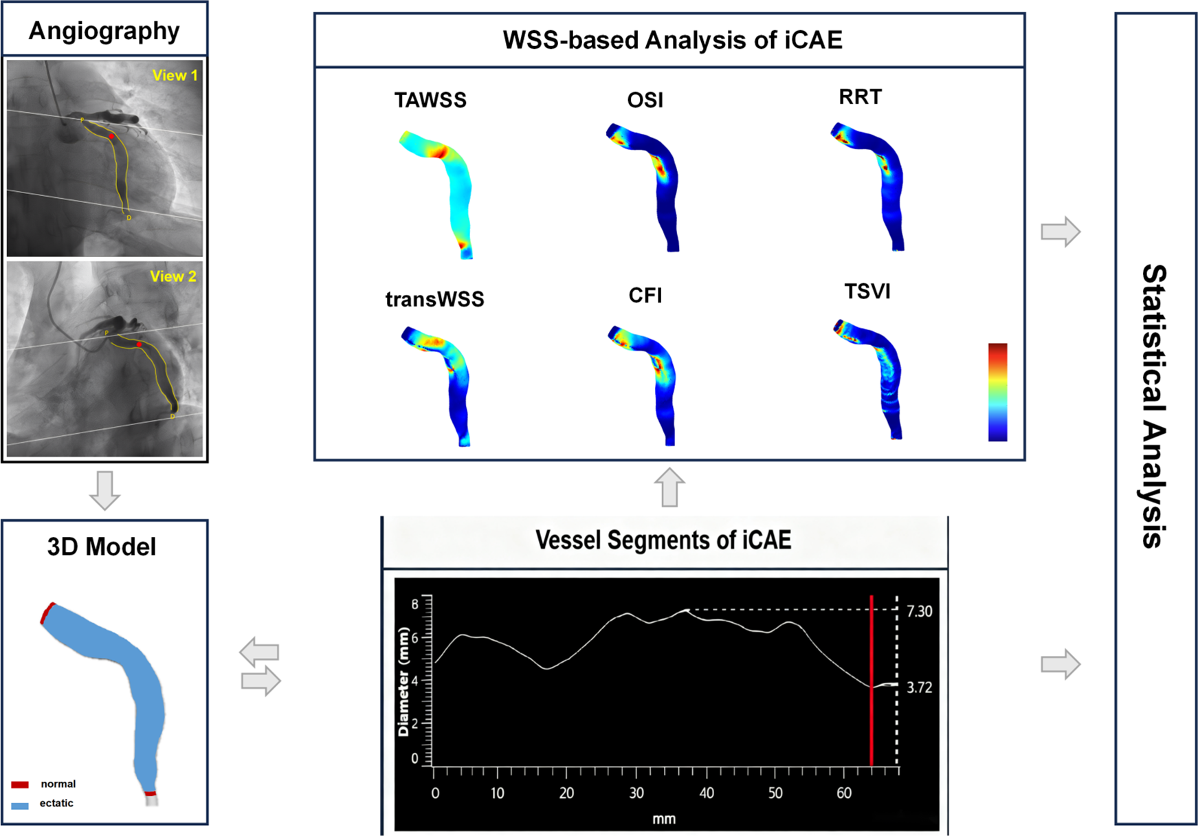 iCAE, isolated coronary artery ectasia; LAD, left anterior descending artery; LCX, left circumflex artery; RCA, right coronary artery; MVD, maximum vascular diameter; TAWSS, time-averaged wall shear stress; OSI, oscillatory shear index; RRT, relative residence time; transWSS, transverse wall shear stress; CFI, cross-flow index; TSVI, topological shear variation index.