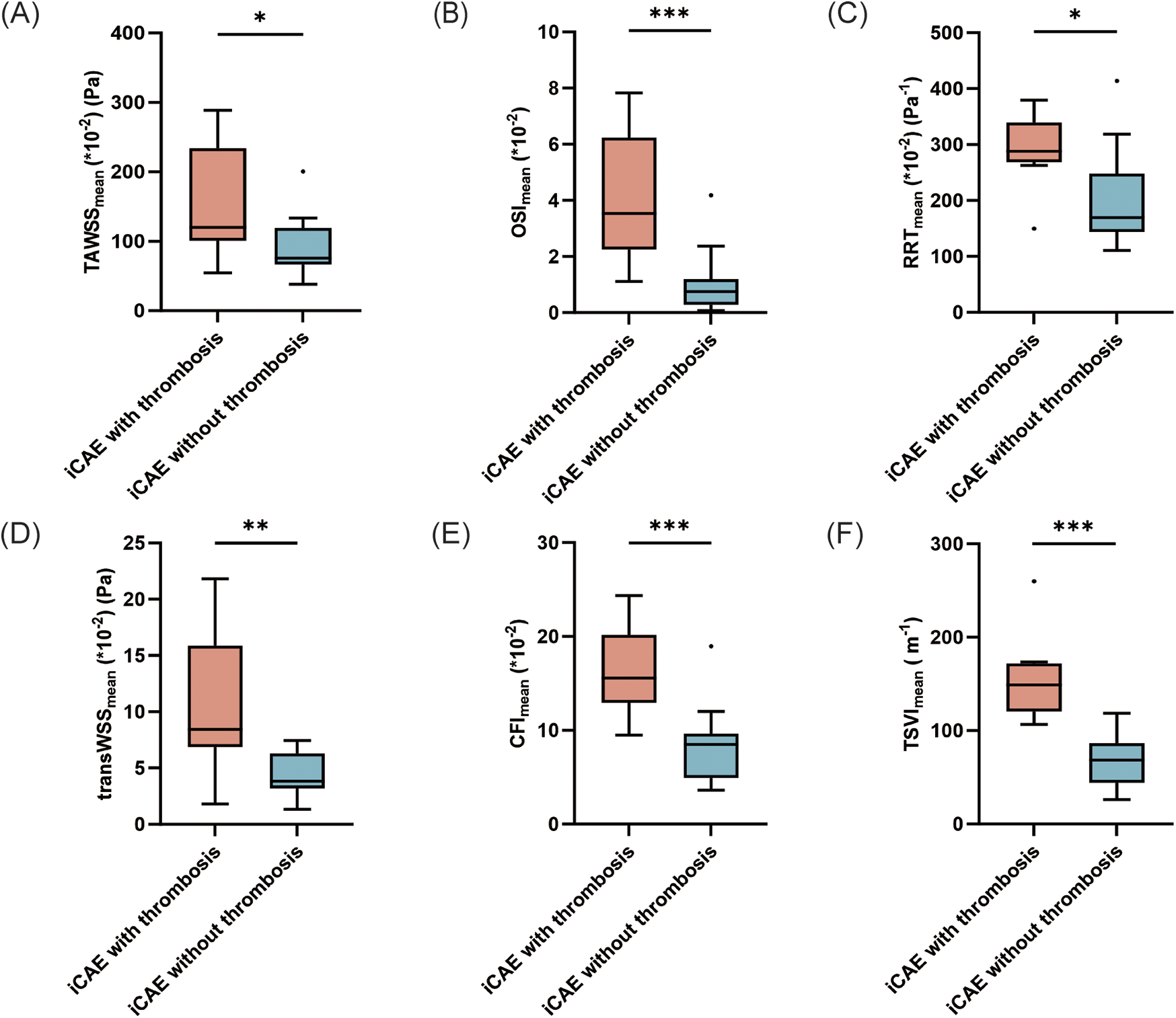 Comparison of the mean values of hemodynamic parameters between ectatic RCA with and without thrombosis. *p < 0.05; **p < 0.01; ***p < 0.001. iCAE, isolated coronary artery ectasia; TAWSS, time-averaged wall shear stress; OSI, oscillatory shear index; RRT, relative residence time; transWSS, transverse wall shear stress; CFI, cross-flow index; TSVI, topological shear variation index.