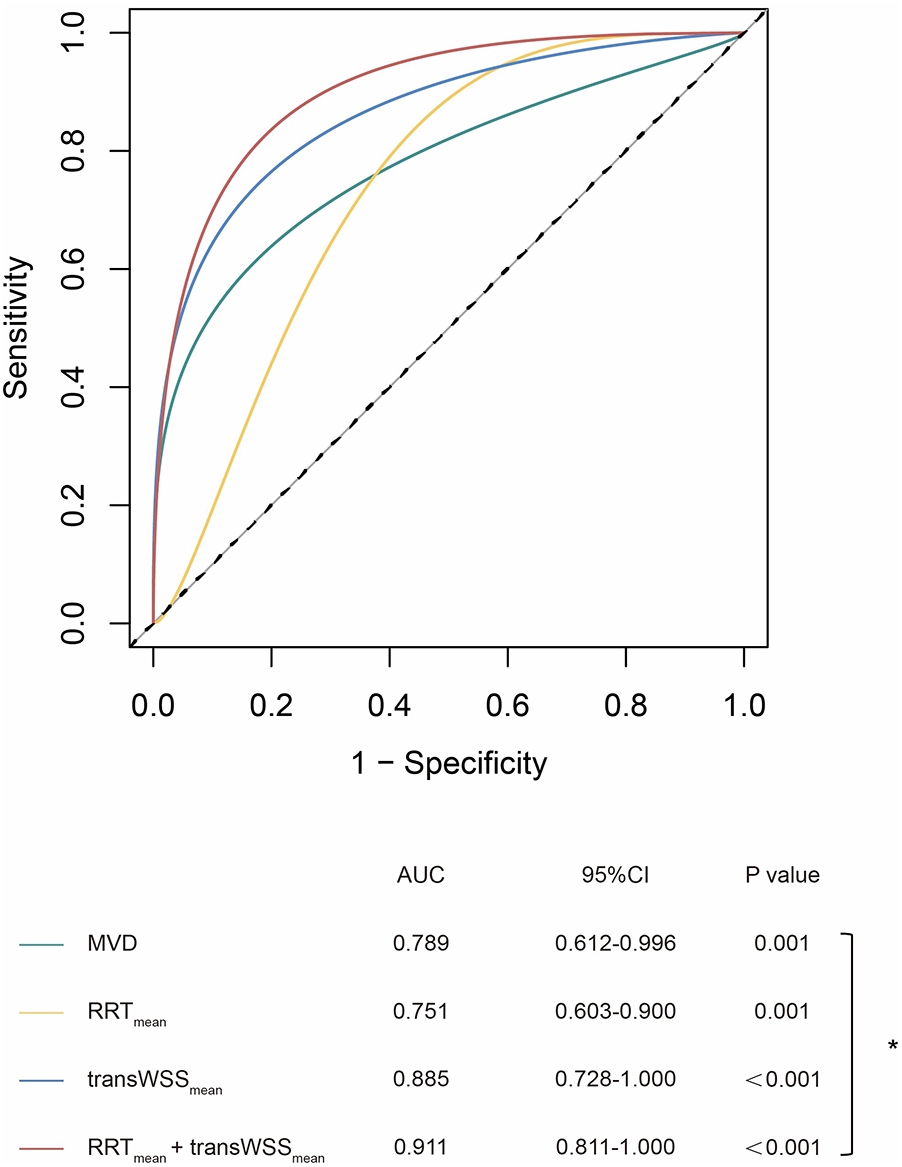 ROC analysis revealed that transWSSmean was the best single parameter to predict thrombotic events in iCAE (AUC = 0.885, sensitivity = 0.909, specificity = 0.881) (Supplementary Table S4). Besides, the AUC of OSImean (AUC = 0.868, sensitivity = 0.909, specificity = 0.786), CFImean (AUC = 0.864, sensitivity = 0.909, specificity = 0.810) and TSVImean (AUC = 0.861, sensitivity = 0.909, specificity = 0.810) were all higher than that of MVD (AUC = 0.789, sensitivity = 0.727, specificity = 0.810), although the differences were not statistically significant (Supplementary Table S4). The RRTmean + transWSSmean model achieved a greater AUC value than MVD, and the difference was statistically significant (0.911 vs. 0.789, p = 0.048) (Figure 4).