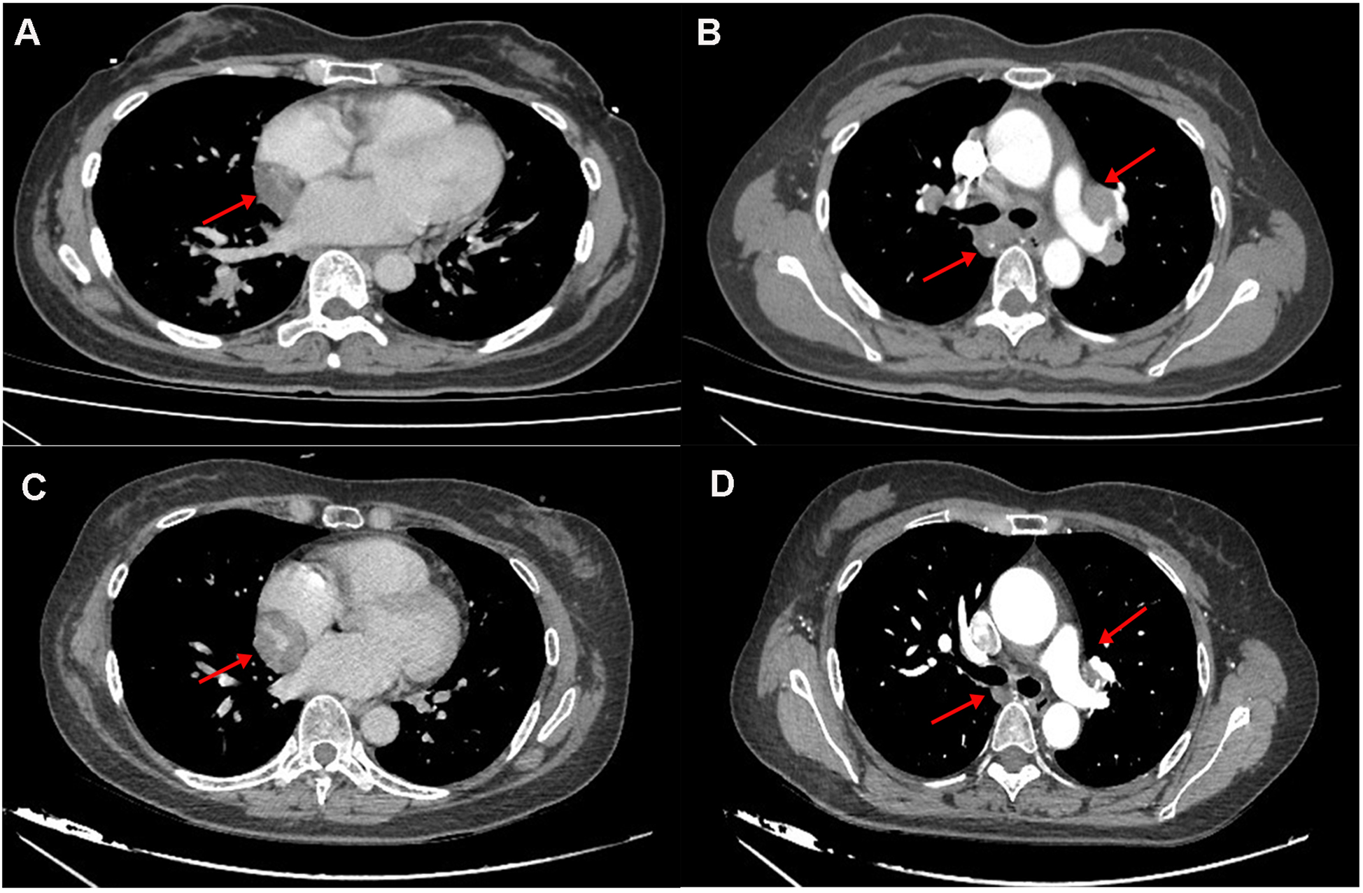 (A,B) the 2022 chest CT revealed a hypodense lesion in the interventricular groove and hilar lymphadenopathy. (C,D) The 2025 CT revealed progressive enlargement of a mass within the atrioventricular groove (measuring 3.3 cm vs. 4.1 cm in 2022), with concurrent regression of bilateral hilar lymphadenopathy.