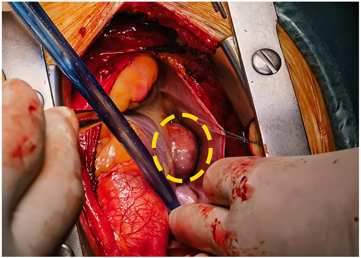 Intraoperative visualization confirmed a tumor in the atrioventricular groove(inside the yellow ellipse).