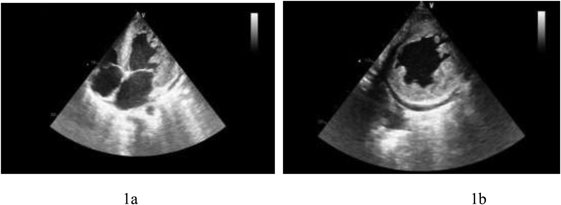 (a) Left ventricular apical four-chamber view showing left ventricular thickening and hypertrabeculation. (b) Left ventricular short-axis view presenting left ventricular thickening and hypertrabeculation.