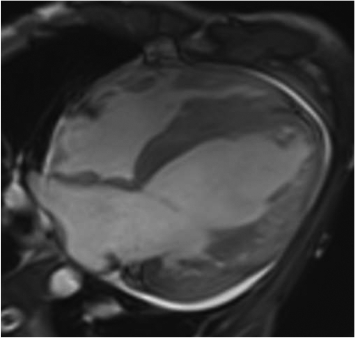 CMR four-chamber heart long axis: left ventricular dilatation, thinning of left ventricular free wall and apex, with increased and disordered trabeculae, presenting a spongy appearance.