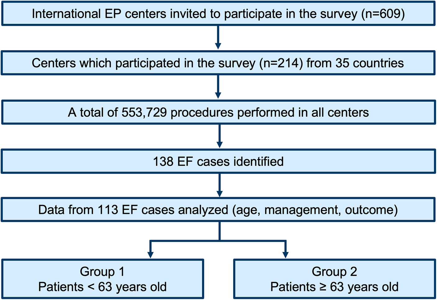 The POTTER-AF study is a worldwide registry on EF following catheter ablation for AF. A total of 553,729 patients underwent AF ablation in 214 centers between 1996 and 2022. Of them, 138 patients experienced EF, and data regarding age, management, and prognosis were available in 113 patients. The population was divided based on the median age.