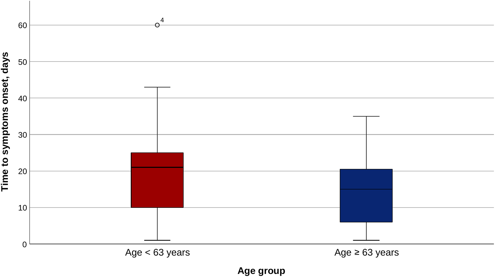 | Duration until initial symptoms, days | 21.0 (10.0, 25.3) | 15.0 (6.0, 21.0) | 0 . 031 |