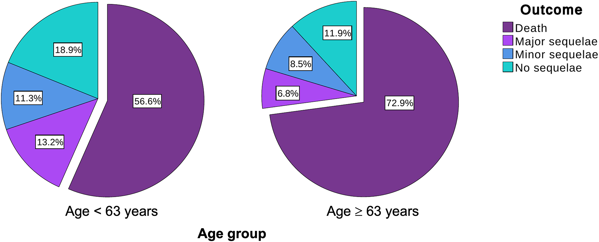 The median age was 63 years; 54 patients were <63 years old (Group 1), and 59 patients were ≥63 years old (Group 2). The groups were similar regarding procedural characteristics. The older population had a shorter time to symptom onset [15.0 (6.0, 21.0) vs. 21.0 (10.0, 25.3) days; p = 0.031]. Group 2 was less likely to receive a brain CT or MRI for diagnosis (25.9% vs. 45.3%; p = 0.046). The older population was more likely to undergo endoscopic treatment without surgery (27.6% vs. 11.3%; p = 0.035). Conservative and surgical treatments were used in similar proportions. A trend toward higher fatality was noted in the older patients (72.9% vs. 56.6%; p = 0.078).