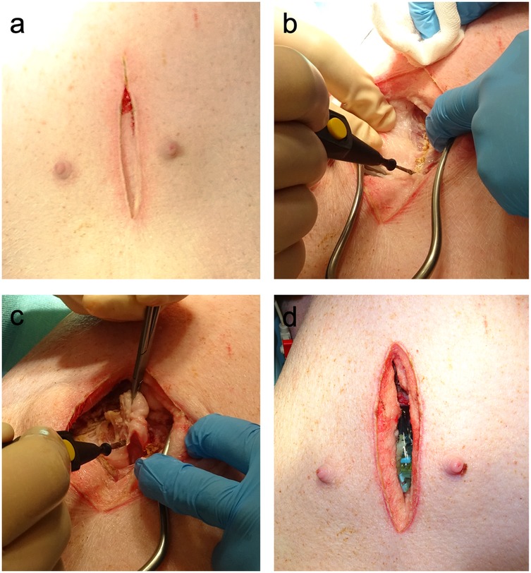 Figure 1. Surgical preparation for subxiphoid echocardiography. (a) In the first step, a median longitudinal skin incision caudal to the xiphoid was made. (b) The underlying connective and adipose tissues were dissected until the linea alba was visualized. Electric diathermy was used for bleeding control. (c) The caudal portion of the cartilaginous xiphoid was resected to gain access to the subxiphoid space. (d) Ultrasound gel was used to optimize the acoustic coupling of the probe with the heart.