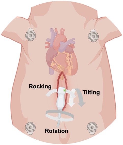 Figure 2. Schematic illustration of the surgical subxiphoid access to obtain epicardial apical echocardiographic views in anesthetized swine. The ultrasound probe was protected by a gel-filled probe cover and inserted into the subxiphoid space. Rotation along the longitudinal axis of the probe, tilting and rocking of the probe allowed different views of the heart. (Created with https://www.biorender.com).