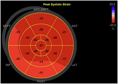Figure 4. Representative bull's eye plot of the left ventricle. This figure shows a 17-segment model of the left ventricle, representing regional peak longitudinal strain values, that were determined during the myocardial deformation analysis.