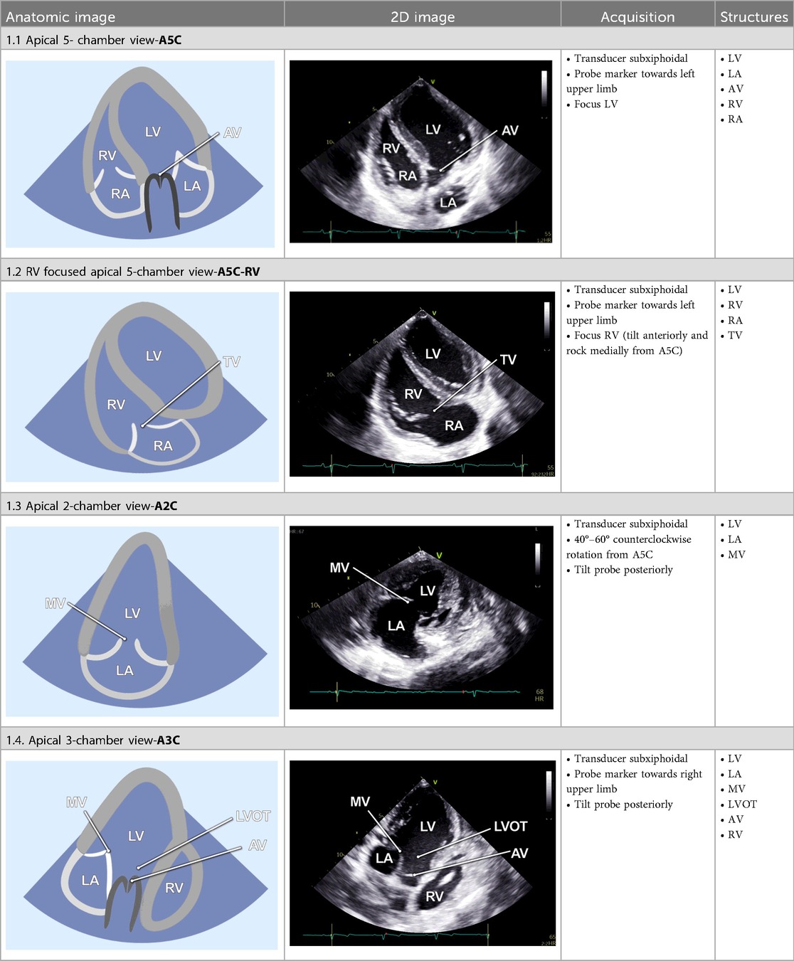 The 2-chamber view (A2C) was obtained by rotating the transducer counterclockwise by 40°–60° from the A5C view and tilting it posteriorly. This view visualizes the LV (including the inferior and anterior wall), the mitral valve (MV) and the left atrium (LA) (Table 1). It is essential for the assessment of LV function and MV motion. Measurements of LV end-diastolic volume (LVEDV), LV end-systolic volume (LVESV), LV- global longitudinal strain (LV-GLS), Pulsed-wave (PW) Doppler and continuous-wave (CW) Doppler of the MV could be conducted in this view. Image acquisition in this view was sometimes challenging when the RV was poorly filled.