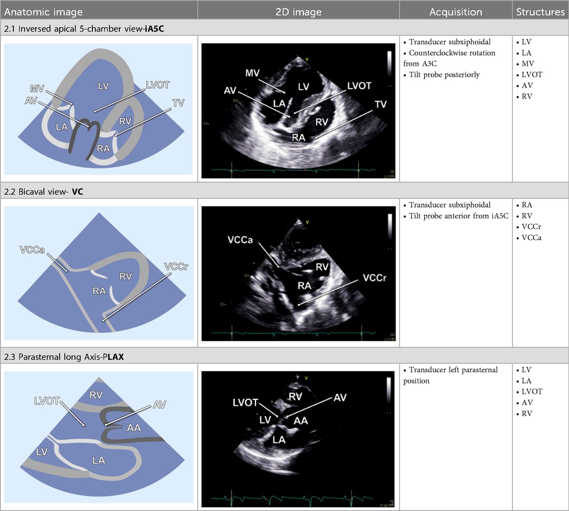 By tilting the transducer anteriorly from the A3C, the inversed 5-chamber view (iA5C) was obtained (Table 2). This view focuses on the RV and TV and partially on the LV. It served as an alternative approach for detailed assessment of the anatomy and function of the RV.
