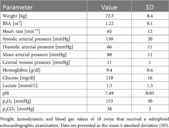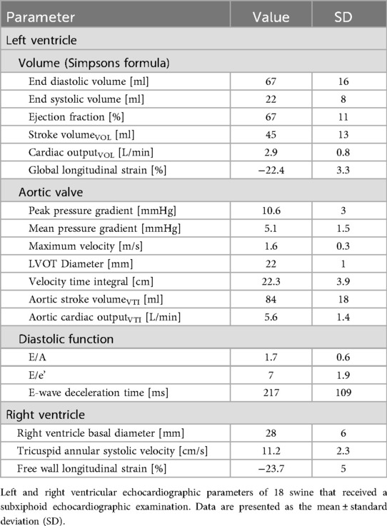 Methods: SE was performed in 19 female German Landrace pigs under general anesthesia using a defined imaging protocol. After the induction of general anesthesia, a small subxiphoid incision was made to optimize the image quality for SE. The echocardiographic imaging protocol was adapted from human 2D-transthoracic echocardiography and included apical 2-, 3-, and 5-chamber views and Doppler measurements of blood flow and tissue velocities. Furthermore, speckle tracking was used to assess left ventricular (LV) and right ventricular (RV) myocardial deformation.