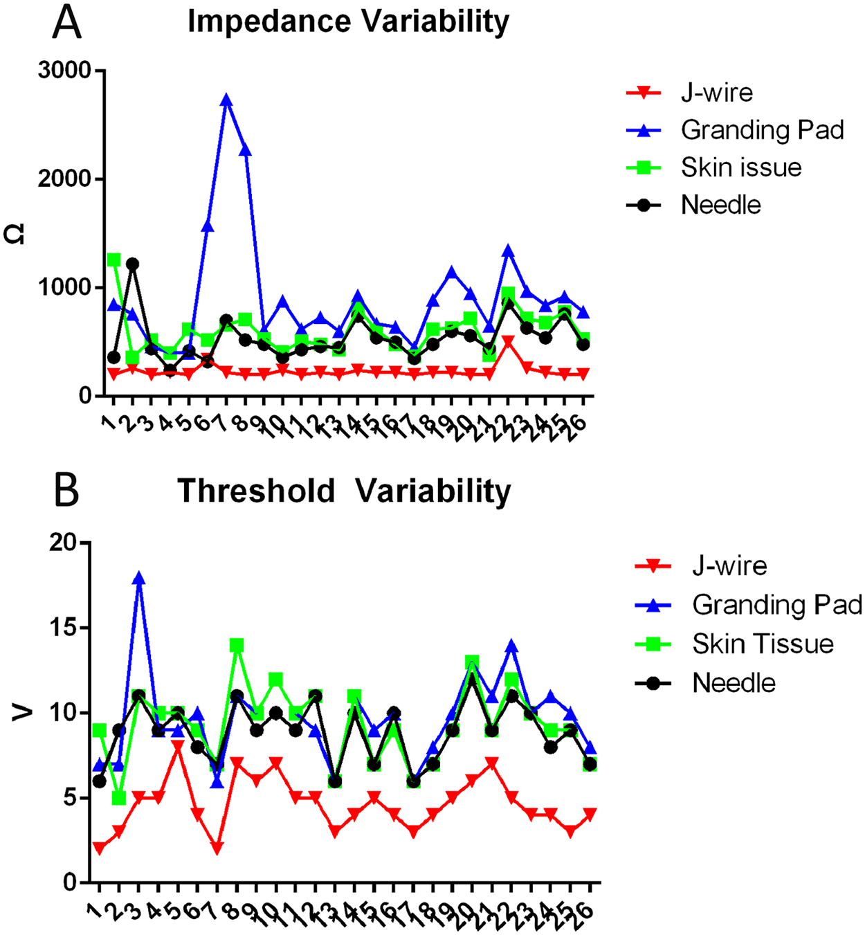 Impedance and threshold variability in different pacing methods. (A) Impedance variability in different pacing methods. J-wire pacing exhibits the lowest pacing impedance variability, while the ground pad shows the greatest impedance variability. (B) Threshold variability in different pacing methods. The threshold variability appears to be similar across all four methods.