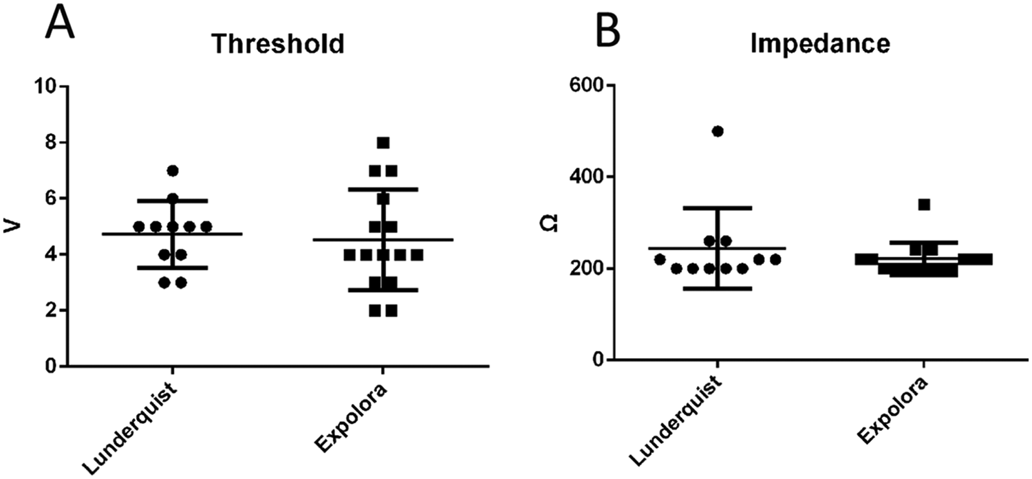 Threshold and impedance in the Lunderquist wire and Explora wire groups. (A) Thresholds in the Lunderquist wire and Explora wire groups. There was no significant difference between the groups. (B) Impedance in Lunderquist wire and Explora wire groups. There was no significant difference between the groups.