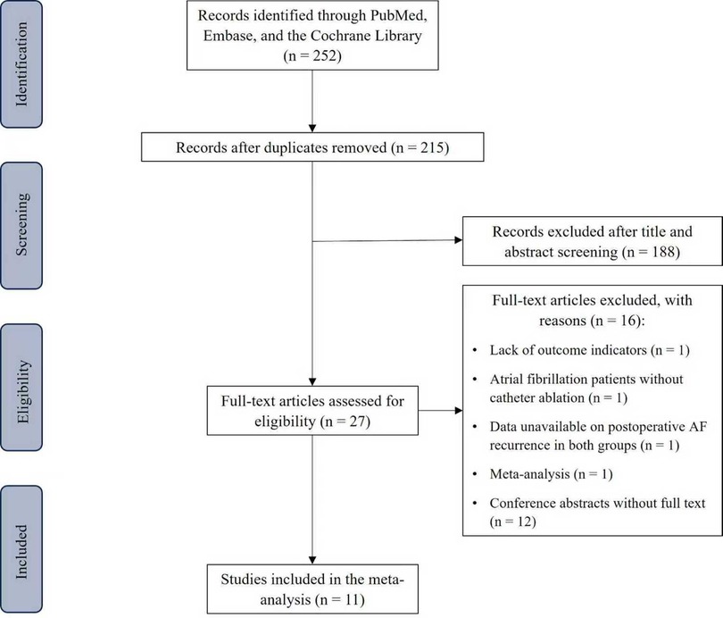 Flowchart depicting a systematic review process for a meta-analysis. Initially, 252 records are identified from databases. After removing duplicates, 215 records remain. Following title and abstract screening, 188 records are excluded. Of the 27 full-text articles assessed for eligibility, 16 are excluded for reasons such as lack of outcome indicators and absence of full text. Eleven studies are finally included in the meta-analysis. The process is visualized through steps: Identification, Screening, Eligibility, and Included.