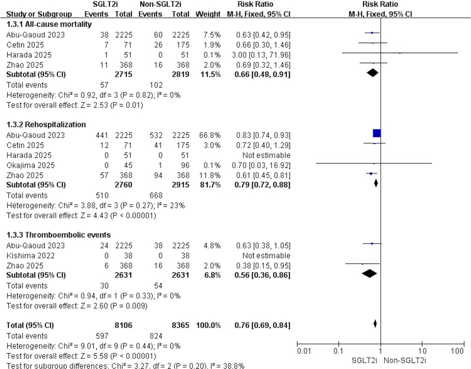 Figure 4. Forest plot illustrating the impact of SGLT2i vs. non-SGLT2i on all-cause mortality, rehospitalization, and thromboembolic events after AF catheter ablation.