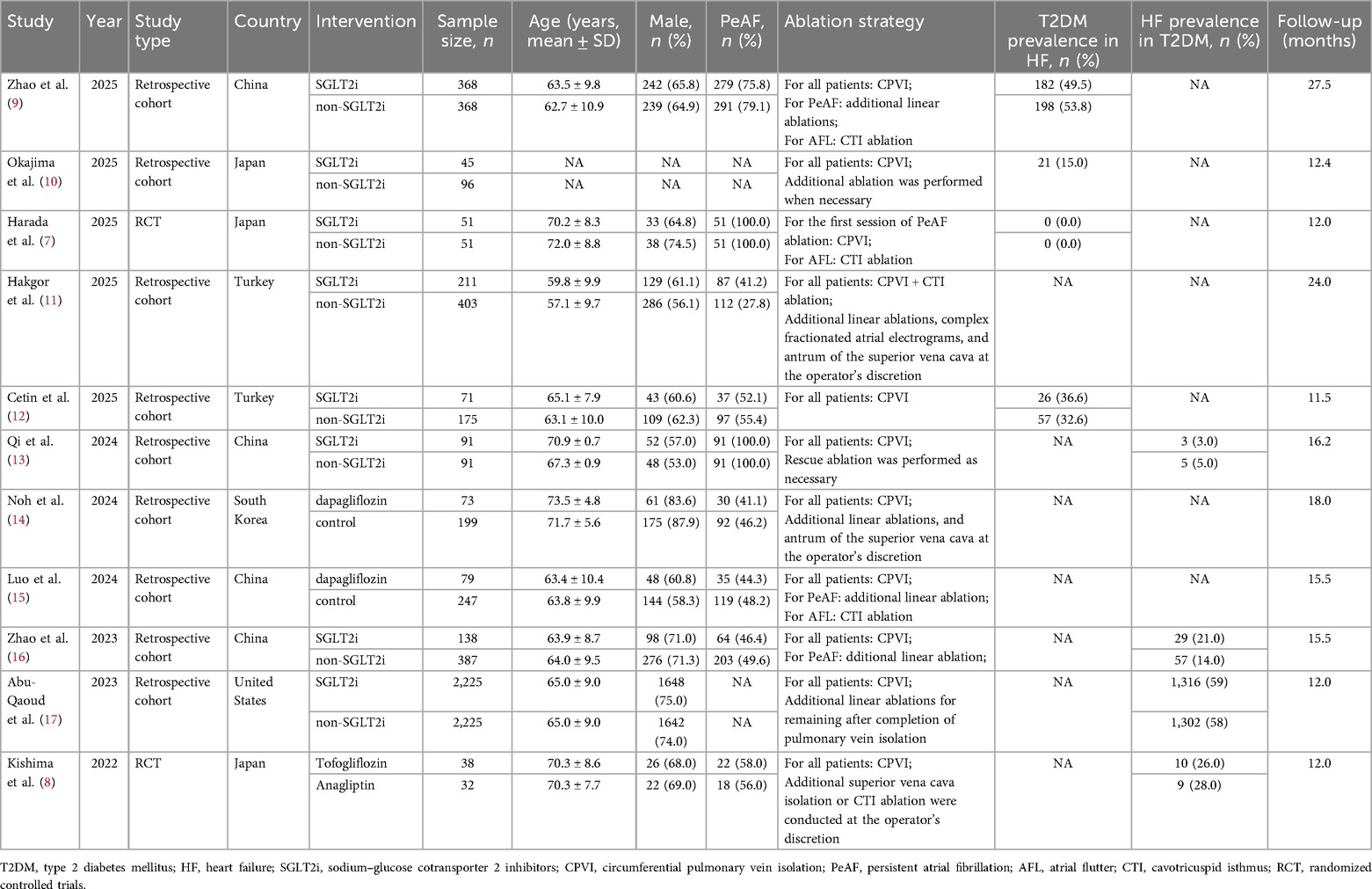 Although Zhao et al. published two studies in 2023 (16) and 2025 (9) using data derived from the Chinese Atrial Fibrillation Registry, they covered distinct time periods and study populations, we analyzed them as separate comparisons within the meta-analysis. Moreover, outcomes were evaluated with propensity score–matched cohorts in Abu-Qaoud et al. (17) and in two studies by Zhao et al. (9, 16). In the studies conducted by Zhao et al. (9), Okajima et al. (10), Harada et al. (7), and Cetin et al. (12), the target population consisted of individuals with AF and HF. In contrast, the studies by Qi et al. (13), Luo et al. (15), Zhao et al. (16), Abu-Qaoud et al. (17), and Kishima et al. (8) focused on AF individuals with T2DM. Both Harada et al. (7) and Qi et al. (13) restricted their analyses to individuals with persistent AF. Most of the included trials utilized both cryoballoon and radiofrequency energy sources for ablation. For paroxysmal AF, the predominant ablation strategy was bilateral pulmonary vein antral isolation. For persistent AF, beyond the above treatment, additional linear ablation was performed as indicated. Individuals with concomitant atrial flutter also underwent cavotricuspid isthmus ablation. A summary of baseline characteristics for each study is shown in Table 1.