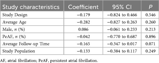 11 studies contributed data: 3,390 treated with SGLT2i vs. 4,274 comparators with non-SGLT2i. Heterogeneity analysis indicated moderate variability among studies (p = 0.03, I2 = 49%); therefore, a random-effects model was applied. Relative to non-SGLT2i, use of SGLT2i was linked to a reduced risk of post-ablation AF recurrence (RR 0.61, 95% CI 0.52–0.71, p < 0.001, Figure 2). Sensitivity analysis confirmed the robustness of this finding (Supplementary Figure S1). When the study by Abu-Qaoud et al. was excluded, I2 = 0%, and the summary of the remaining studies showed no reversal of the result (RR: 0.58, 95% CI: 0.51–0.66, P < 0.001). Meta-regression analysis indicated that study design, average age, proportion of males, proportion of persistent AF, average follow-up time, or study population had no effect on the above result (Table 2).