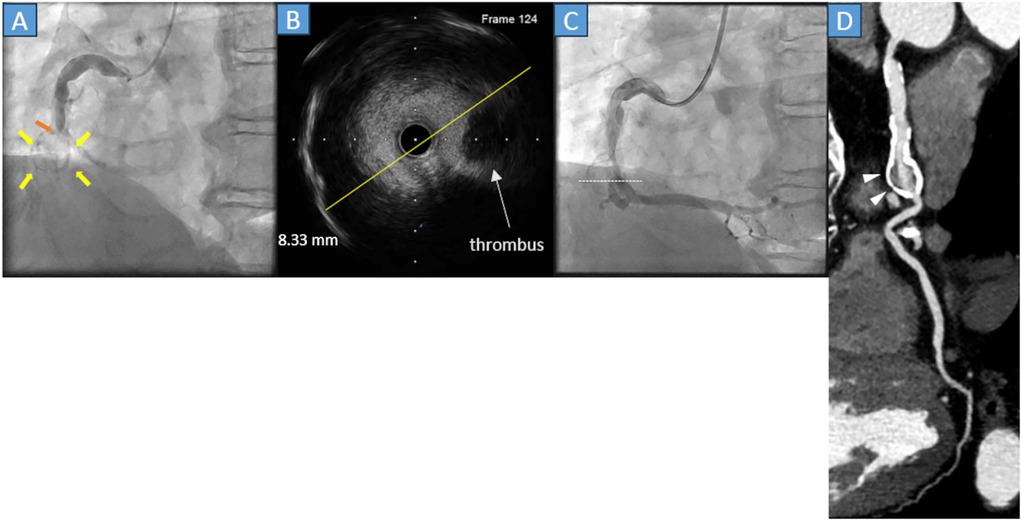 Figure 1. (A) Coronary angiography (CAG) reveals acute total occlusion of the middle right coronary artery (orange arrow) with a circular calcified structure (yellow arrows). (B) The cross-sectional image of the intravascular ultrasound (IVUS) reveals that the diameter of the lesion was 8.33 mm (yellow line) with thrombus and calcification of the vessel wall. (C) The final CAG reveals a Thrombolysis in Myocardial Infarction grade III flow. The white dots in the angiography correspond to the cross-sectional IVUS image. (D) Cardiac computed tomography in the chronic phase reveals that preserved right coronary flow and the presence of a saccular aneurysm with severe calcification (gray arrowheads).