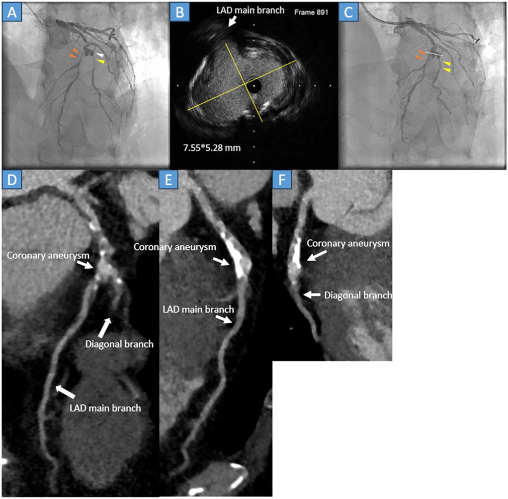 Figure 2. (A) Coronary angiography reveals severe stenosis at the middle segment of the left anterior descending artery (LAD) (orange arrowheads) and the second diagonal branch (yellow arrowhead), just after the aneurysm formation (white arrowhead). (B) The cross-sectional image of the intravascular ultrasound (IVUS) detects a 7.55*5.28 mm (yellow lines) mild calcified oval-shaped coronary aneurysm. (C) The LAD (orange arrowheads) and second diagonal branch (yellow arrowheads) were successfully treated with the drug-coated balloon. The white dots in the angiography correspond to the cross-sectional IVUS image. (D) Cardiac computed tomography showing patient LAD and secondary diagonal branches with calcification. (E) The LAD is patent with atherosclerotic change and calcification. (F) The second diagonal branch is patent, and the main branch of the LAD is severely calcified.