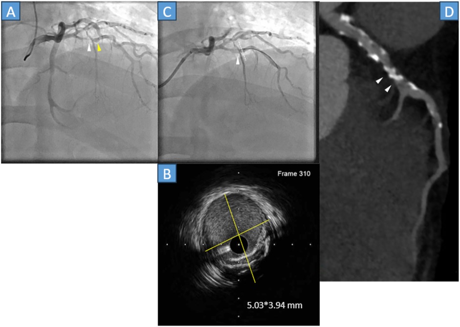 A 49-year-old male with a history of stent-assisted coiling of an intracranial aneurysm, hypertension, and dyslipidemia without Kawasaki disease was admitted to our hospital because of chest pain. The ECG did not show any substantial changes; however, the cardiac troponin T level was 0.083 ng/mL (normal range, <0.014 ng/mL). Emergency CAG was performed because of a non-STEMI. The CAG demonstrated that the proximal LAD artery had severe stenosis (Figure 3A, white arrowhead) with an aneurysm (Figure 3A, yellow arrowhead). Thus, in April 2022, PCI was performed. A 0.014-inch guidewire was crossed, and IVUS was performed. IVUS revealed a 5.03*3.94 mm aneurysm and lesion calcification (Figure 3B yellow lines, Figure 3C white dots). After dilating the lesion with a 2.5*13 mm scoring balloon, a 3.0*15 mm paclitaxel DCB was used; final CAG showed a fusiform coronary aneurysm, whose flow with National Heart, Lung, and Blood Institute grade A dissection (Figure 3C, white arrowhead). Following PCI, the patient was asymptomatic, and medication therapy: Aspirin, clopidogrel, statin, and ezetimibe. After 3 months, clopidogrel was discontinued. Approximately 3 years and 3 months later (July 2025), cardiac CT was performed. The LAD was calcified, and the target lesion was patent (Figure 3D, white arrowheads).