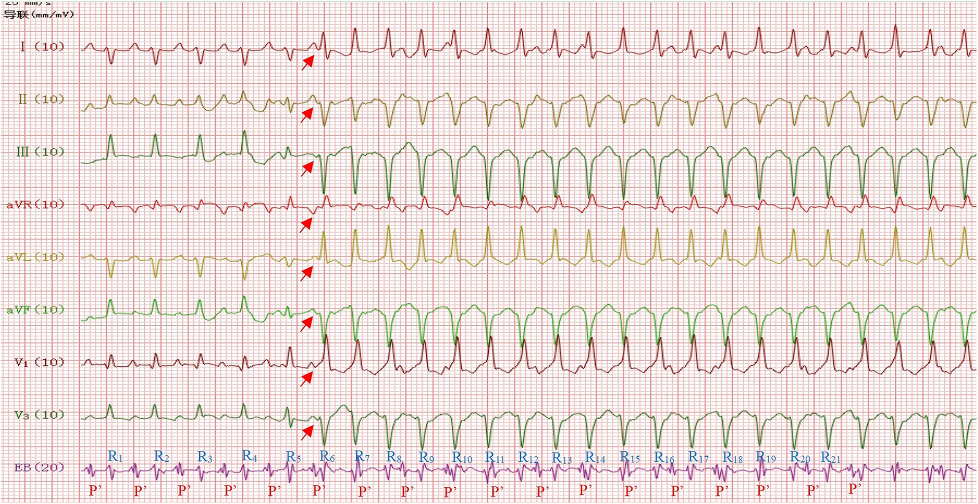Narrow QRS wave tachycardia: ventricular rate 182 beats/min (RR interval = 328 ms), P’P ‘interval = 328 ms, RP’interval = 176 ms, P’R interval = 152 ms, P’upright in leads I, II, III, aVF,V1,V3 and P’inversion in lead aVR (Red arrow). Wide QRS wave tachycardia: ventricular rate 241 beats/min (RR interval = 248 ms), QRS duration 74 ms, QRS electrical axis −83°, R5 was identified as a ventricular fusion wave. EB = Esophageal Bipolar Lead.