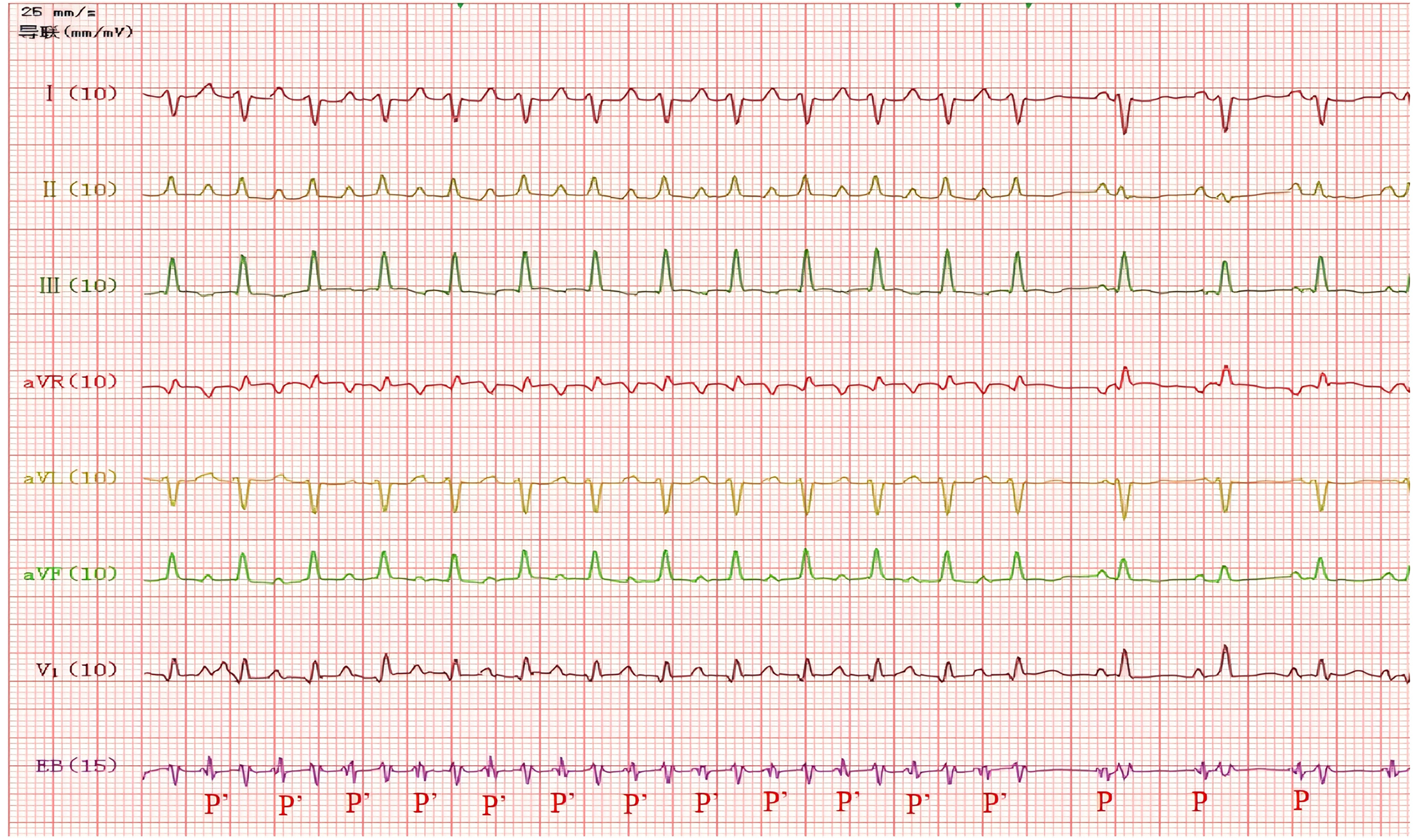 Using the DF-5A cardiac electrophysiological diagnostic and therapeutic instrument produced by Suzhou Oriental Electronic Instrument Factory, a 4-pole esophageal electrode catheter was inserted through the mouth and advanced to 15 cm from the teeth, where the largest atrial wave was recorded. Continuous recordings from the body surface and esophageal ECG showed alternating narrow and wide QRS tachycardia (Figure 2). During narrow QRS wave tachycardia, the ventricular rate was 182 beats per minute (RR interval = 328 ms), with the esophageal lead showing a clear and prominent P' wave that appeared multi-directional, with a P'P' interval of 328 ms, an RP' interval of 176 ms, and a P'R interval of 152 ms. The RP' interval was greater than the P'R interval, which indicated that the P'R interval was prolonged, with the P' wave upright in leads I, II, III, and aVF. During wide QRS wave tachycardia, the ventricular rate was 241 beats per minute (RR interval = 248 ms), with a QRS duration of 74 ms and a QRS axis of −83°. The V1 and aVR leads showed a unidirectional R wave pattern, while the II, III, and aVF leads exhibited an rS pattern, with SIII > SII, suggesting a left anterior fascicular block. The morphology of the P' wave and the P'P' interval were the same as during narrow QRS wave tachycardia, with the ventricular rate exceeding the atrial rate and atrioventricular dissociation, suggesting ventricular tachycardia, where R5 was identified as a ventricular fusion wave. During the recording of the esophageal electrocardiogram, the supraventricular tachycardia stopped on its own, restoring sinus rhythm, with a normal PR interval. Through careful comparative analysis, the P wave in lead III is inverted during narrow QRS complex tachycardia, while it is upright during sinus rhythm (Figure 3). Therefore, the esophageal electrocardiogram confirmed the diagnosis of dual tachycardia (persistent atrial tachycardia combined with short episodes of ventricular tachycardia).