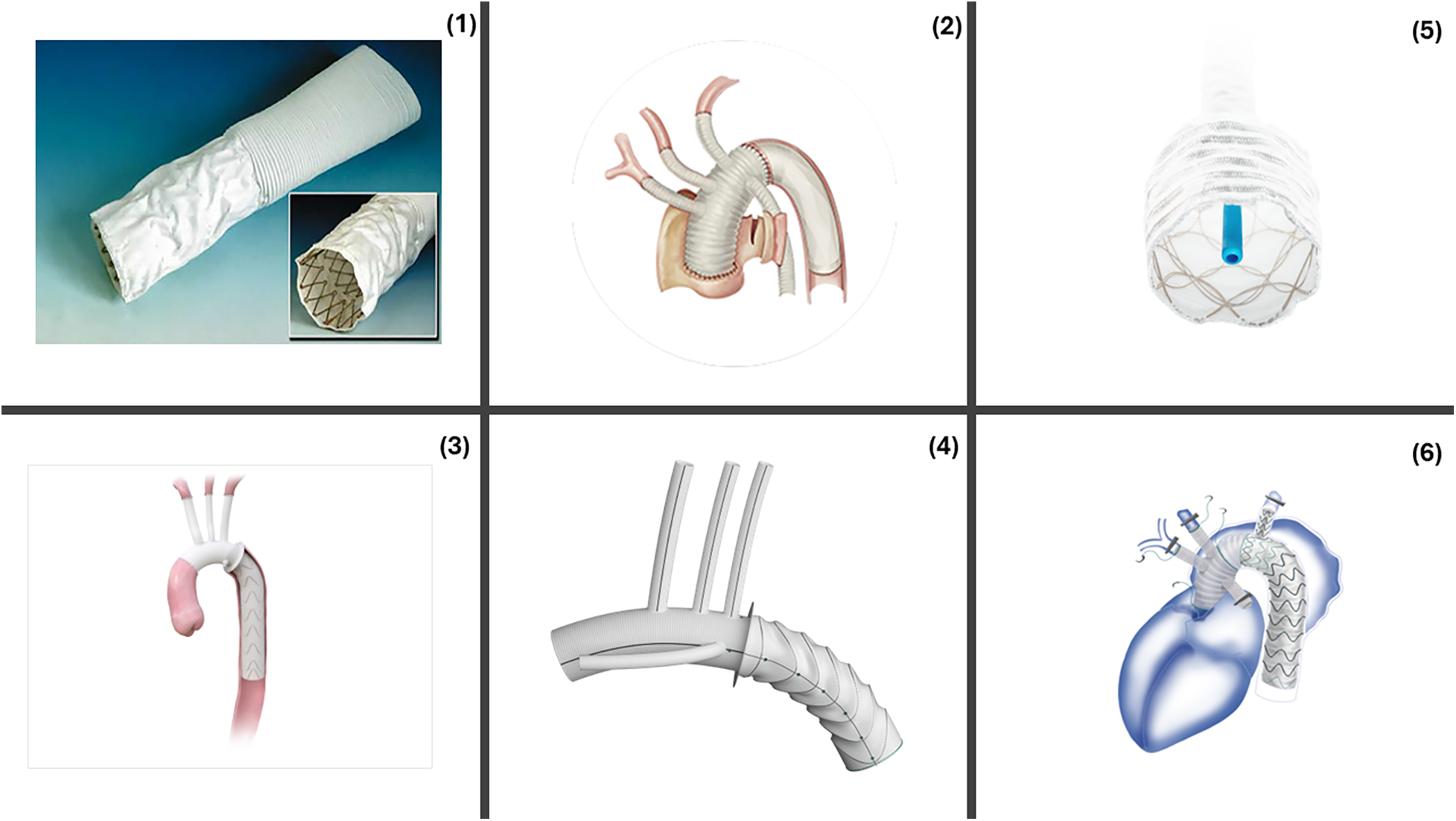 Commercially available FET devices. (1) Chavan-Haverich™ (Germany), the prototypical graft contains a stiff, large-diameter stent which limits its use in acute dissections. (2) Cronus™ (China) is a Co-Cr alloy. Its compactness allows for precise deployment (A) Before deployment (B) After deployment. (3) E-vita Open™ (Germany) includes a polyester graft with a flexible nitinol stent. E-vita Open Plus™ added a sewing collar to the earlier model allowing easier distal anastomosis. E-vita Neo™ added a tetra-furcate graft allowing anastomosis in more proximal zones, reduced SINE, precision deployment. (4) Thoraflex™ Hybrid includes four branches for arch vessels and a branch for perfusion. The circular nitinol ring arrangement helps minimize the radial force. (5) J Graft™ Frozenix has an oval, double-layered nitinol stents that accommodate the vessel curvature. (6) Fontus™ contains a branched stent-graft portion that allows zone 1 distal anastomosis, reduced circulatory arrest and simplified full arch reconstruction. Reproduced with permission from “The “hybrid prosthesis” (Chavan-Haverich endograft, Curative, Dresden, Germany) was made of a woven vascular prosthesis with stainless steel stents affixed to the inner aspects of its distal end” by Matthias Karck and Nawid Khaladj, licnesed under CC BY.