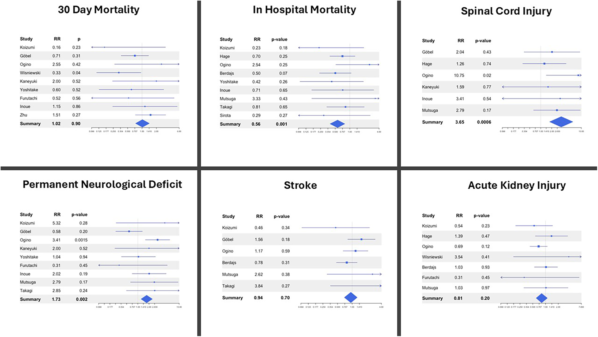 Data extraction focused on 30-day mortality, in-hospital mortality, stroke, permanent neurologic deficit, spinal cord injury, and acute kidney injury. Extraction was performed independently by two reviewers, and discrepancies were resolved by consensus to minimize errors and subjective interpretation.