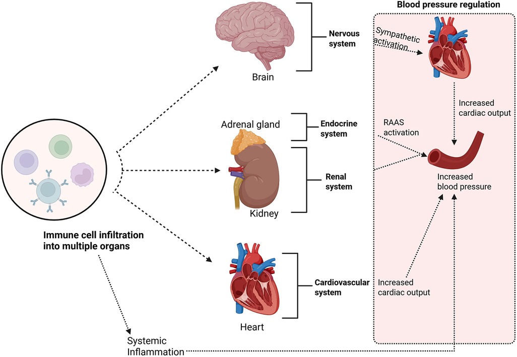 Figure 1. Immune cells infiltrate organs critical to blood pressure regulation, such as the blood vessels, kidneys, heart, and brain; leading to chronic inflammation. This chronic inflammatory state disrupts normal organ function and contributes to the onset and progression of hypertension. Created using Bio-render.