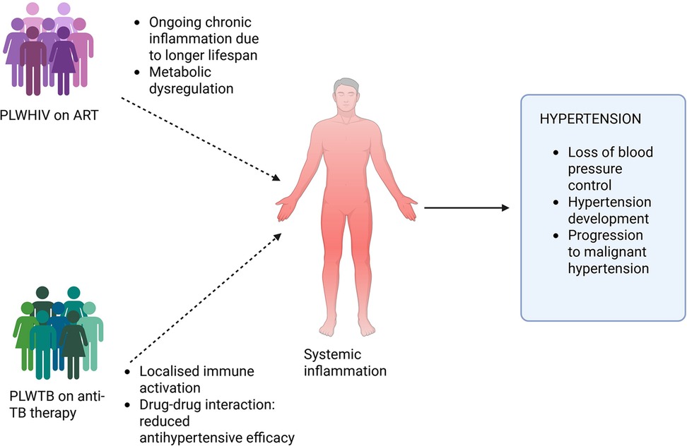 The growing intersection between infectious diseases and non-communicable conditions represents one of the most pressing challenges for health systems in SSA. Among PLWHIV and TB, the emergence and persistence of hypertension and resistant hypertension have significant implications for long-term morbidity and mortality. This complex clinical overlap is driven by a convergence of factors, including chronic immune activation, inflammation, endothelial dysfunction, and metabolic derangements induced by HIV infection, TB, and their respective treatments. ART, while lifesaving, is associated with metabolic complications which increase the risk of hypertension. Similarly, anti-tuberculosis medications, most notably rifampicin, can interfere with the pharmacokinetics of commonly used antihypertensive drugs, leading to subtherapeutic drug levels and poor blood pressure control. Moreover, HIV and TB themselves exert profound immunological effects that may contribute to vascular inflammation and endothelial injury, further complicating the pathophysiology of hypertension in co-infected individuals.