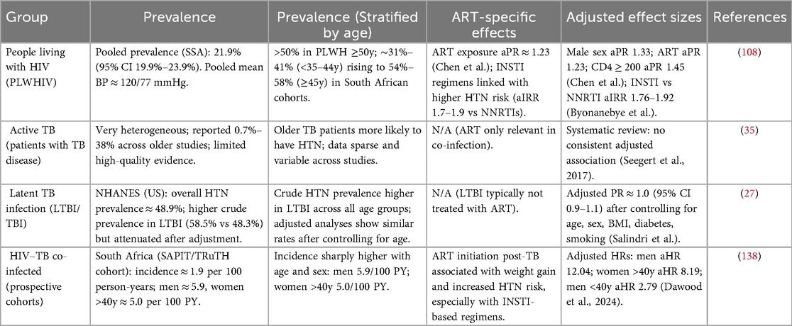 107. Chen A, Chan Y-K, Mocumbi AO, Ojji DB, Waite L, Beilby J, et al. Hypertension among people living with human immunodeficiency virus in sub-saharan Africa: a systematic review and meta-analysis. Sci Rep. (2024) 14(1):16858. doi: 10.1038/s41598-024-67703-5