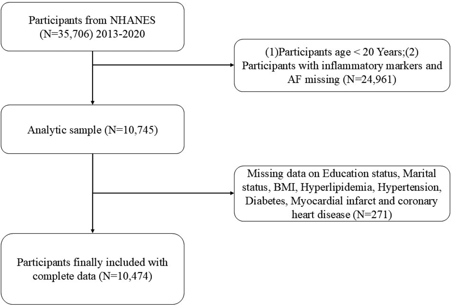 The NHANES employs a complex sampling design to produce a representative sample of the US population every two years. Its primary purpose is to assess the health and nutritional status of Americans. The NHANES program was approved by the Institutional Review Board of the National Center for Health Statistics, and each participant provided written informed consent. The survey includes demographic, dietary, physical examination, laboratory, and questionnaire data. A total of 10,474 participants aged 20 years and older were included across four survey cycles from 2013 to 2020 (Figure 1).