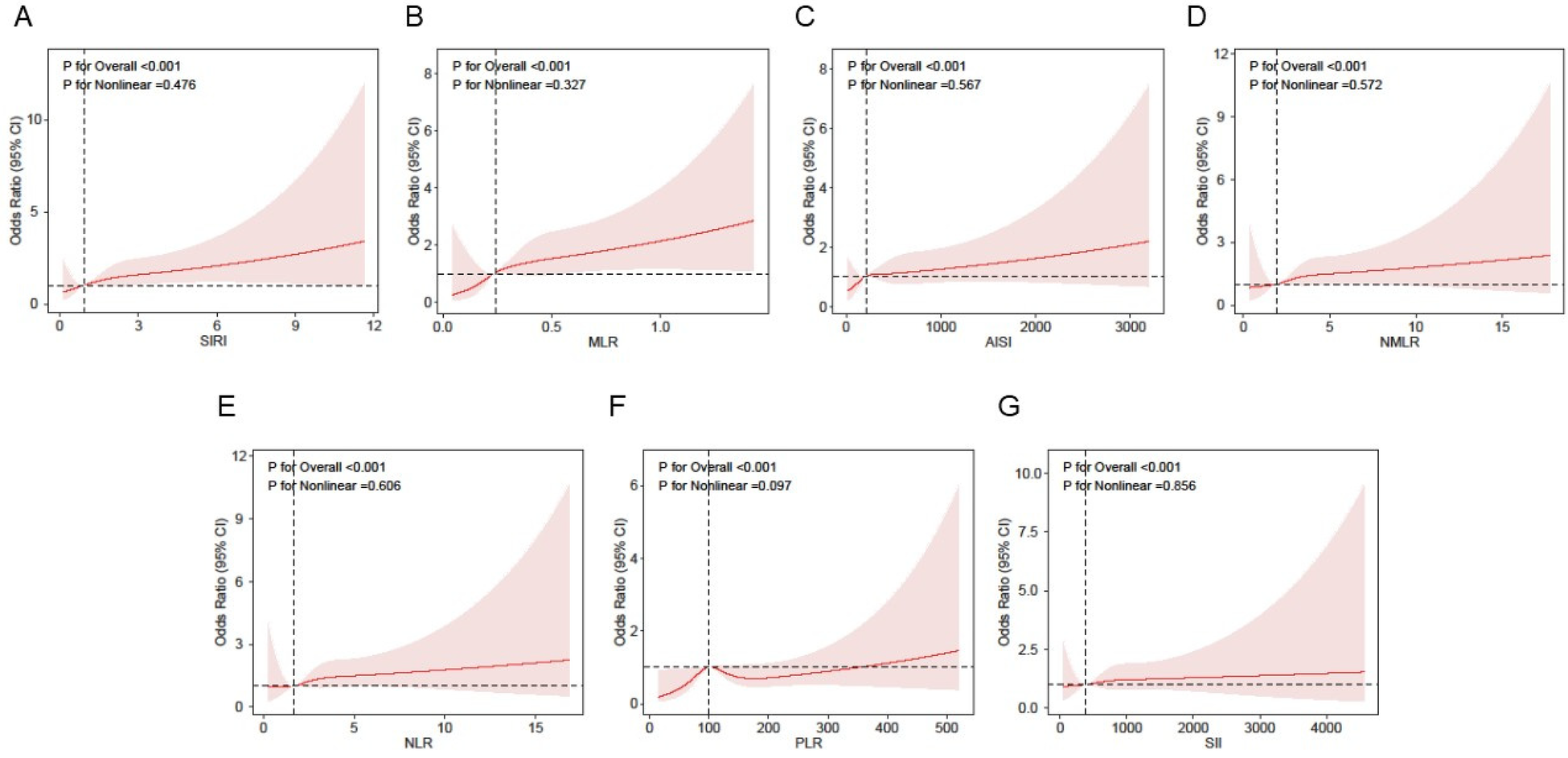 Based on the obtained peripheral blood cell counts, we calculated seven inflammation biomarkers: SIRI,MLR,AISI,NMLR,NLR,PLR and SII. The calculations were defined as: SIRI=neutrophil counts×monocyte counts/lymphocyte counts, MLR = monocyte counts/lymphocyte counts, AISI=neutrophil counts×platelet counts×monocyte counts/lymphocyte counts, NMLR=(monocyte counts + neutrophil counts)/lymphocyte counts, NLR=neutrophil counts/lymphocyte counts, PLR=platelet counts/lymphocyte counts, SII=platelet counts×neutrophil counts/lymphocyte counts.