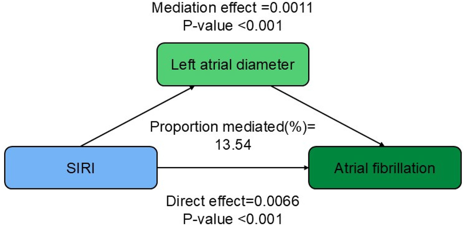 Of the 10,474 participants in the NHANES database, 136 (1.3%) were diagnosed with AF. After full adjustment, the highest SIRI tertile showed a significantly increased risk of AF compared with the lowest tertile (OR = 2.182; 95% CI: 1.094–4.354; P = 0.027). RCS analysis revealed a linear positive association between SIRI and AF risk (overall P > 0.05). Subgroup analyses and interaction tests indicated that the positive association between SIRI and AF persisted across different conditions (all p-value for interaction > 0.05). Results were then validated using the case management system of Zibo Central Hospital. In that cohort, after full adjustment, the highest SIRI tertile again had a significantly increased risk of AF vs. the lowest tertile (OR = 1.436; 95% CI: 1.248–1.652; P < 0.001). Mediation analysis indicated that LA diameter mediated 13.54% of the association between SIRI and AF.