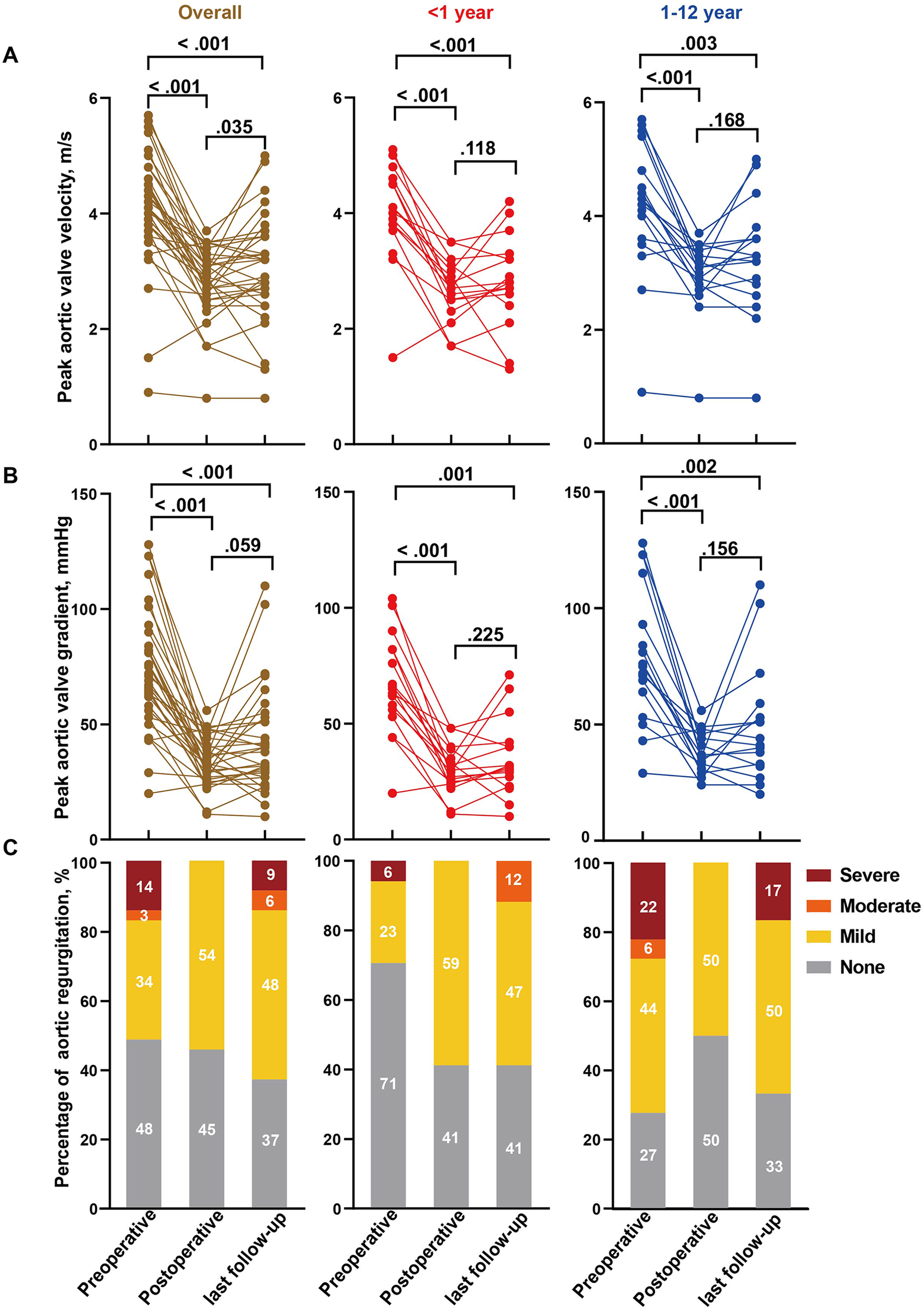 Hemodynamic alterations of the aortic valve in patients underwent AVP with a pericardium patch. Comparison of preoperative, postoperative and last follow-up aortic valve peak velocity (A), peak gradient (B) and regurgitation (C) in overall cohort, infants (≤1 year) and children age >1 year. Analyses were performed based on 33 patients with follow-up data. Percentages may not sum to 100% because of rounding.