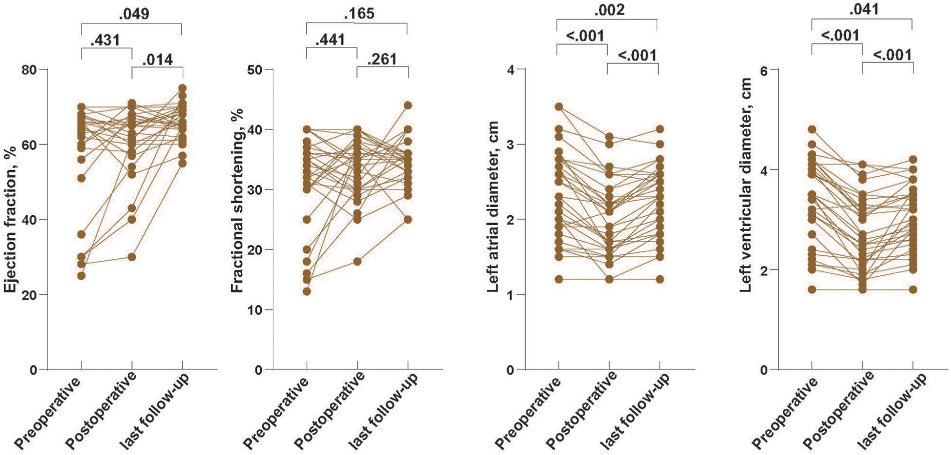 In the 33 patients with serial TTE data, left ventricular systolic function was generally preserved throughout follow-up (Figure 3). Ejection fraction remained within the normal range at all three time points, with no significant change between preoperative and early postoperative examinations, and a modest but statistically significant increase from early postoperative assessment to last follow-up and from preoperative to last follow-up (p = 0.049 and p = 0.014, respectively). Fractional shortening likewise remained stable over time, without significant pairwise differences (all p ≥ 0.165). In contrast, chamber dimensions showed a consistent reduction after AVP: both left atrial and left ventricular end-diastolic diameters decreased significantly from preoperative to early postoperative assessment and further declined by the time of last follow-up (all p ≤ 0.041) (Figure 3).
